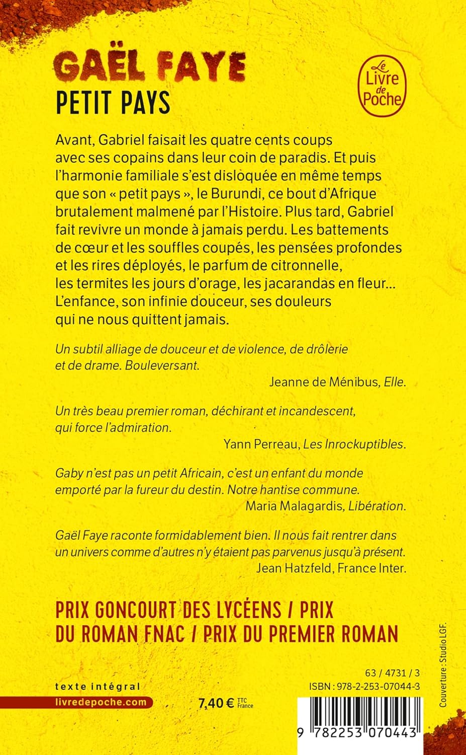 Il y a toujours quelque chose d’attirant dans un premier roman, car c’est celui où un auteur se livre le plus et nous offre ce qu’il a de plus précieux dans le coeur. C’est un besoin de se confier, de partager, c’est aussi comme un accouchement de sa pensée et des trésors de son ame.Dans ce livre j’ai trouvé malgré tout que le démarrage est un peu lent. Gael Faye, à travers le héros Gaby n’en finit pas de raconter son enfance de gamin métisse, père français, mère africaine, au Burundi, une enfance qui ressemble à beaucoup d’autres. C’est la vie d’un quartier assez aisé, où les enfants se regroupent et expérimentent tout ce qu’ils peuvent, dans une semi-liberté, où ils forgent leur caractère.Cette partie destinée à préparer le drame qui va suivre, était nécessaire, mais elle m’a paru un peu stagnante.Et puis c’est la guerre, la division entre les tribus. Les Tutsi sont menacés par les Hutu. Ce sont des massacres.Gaby est français par son père, sa mère est Tutsi.Nous avons tous entendu parler de ces événements dramatiques. Mais là , avec le petit Gaby, nous plongeons au coeur de l’horreur.La deuxième partie du livre donc, nous remplit de peine et d’effroi, et Gaby nous fait vivre toute cette partie de son adolescence sacrifiée avec un grande force de caractère, car il écrit avec ses larmes, sûrement.La fin est bouleversante c’est là que se révèle la merveille de ce livre qui a hautement mérité un grand prix, qui plus est le Goncourt des lycéens. C’est tout à fait logique qu’il ait profondément ému les jeunes.Dans le courant du roman, du reste, on apprend que Gael Faye, alias Gaby, a pris goût à la lecture et sans doute à l’écriture, en découvrant l’impressionnante bibliothèque d’une riche voisine qui lui a généreusement prêté ses livres.Tous mes compliments à Gael Faye pour ce récit authentique. Et quel style raffiné, poétique à souhait, quelle sensibilité ! Gaby Faye est un auteur remarquable déjà . Cela promet !